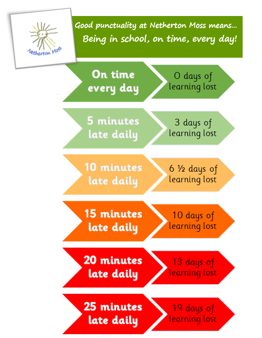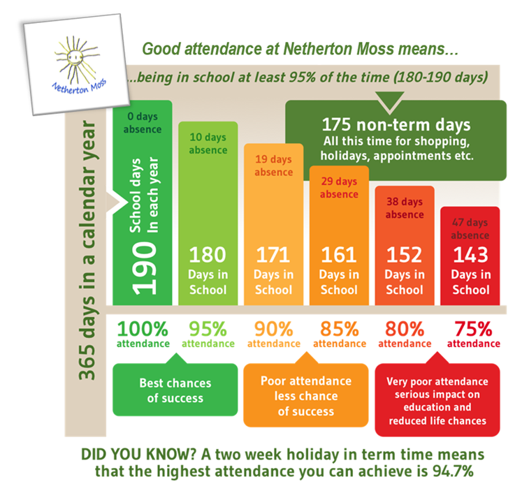 At Netherton Moss Primary, we monitor the attendance of every child in the school on a daily basis and, in partnership with our Education Welfare Officer, we will work with and support those children and their families who are not attending school without sufficient reason. 90% attendance sounds good, but as you can see below, it means that your child misses out on a significant amount of their education.
